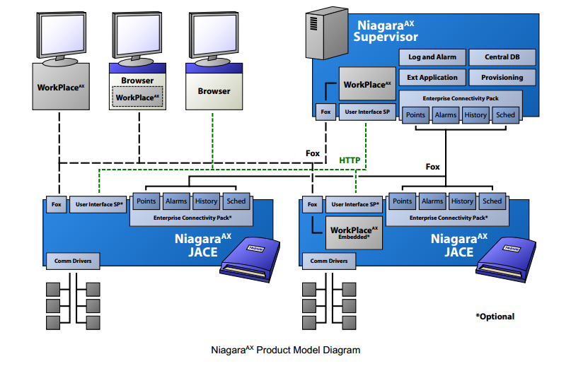 The Niagara 4 Supervisor is an IoT (Internet of Things) software platform used in server-class applications. It makes managing all buildings at an enterprise level possible, giving facilities managers the ability to quickly respond to problems and insights to optimize their system. The Niagara 4 Supervisor allows multiple Niagara-based JACE® controllers, along with other IP-based controllers and field devices, to be networked together. It serves real-time graphical information to standard Web-browser clients and provides server-level functions. These functions include centralized data logging/trending, archiving to external databases, alarming, dashboarding, system navigation, master scheduling, database management, and integration with other enterprise software applications through an XML interface (oBIX standard). Also, it provides a comprehensive graphical engineering toolset for application development.